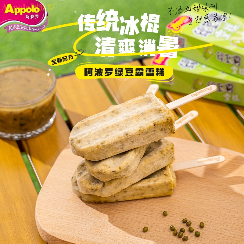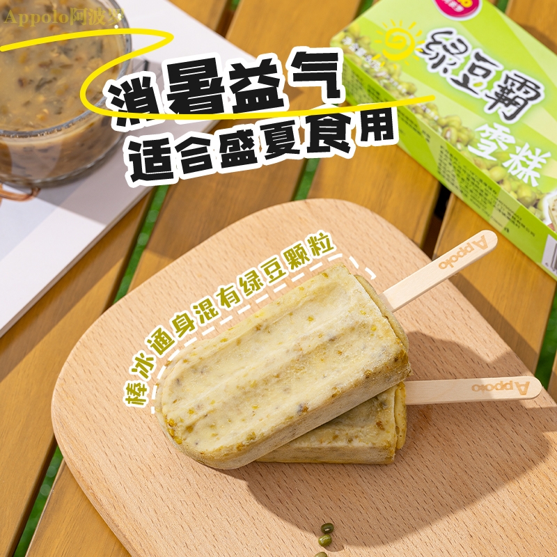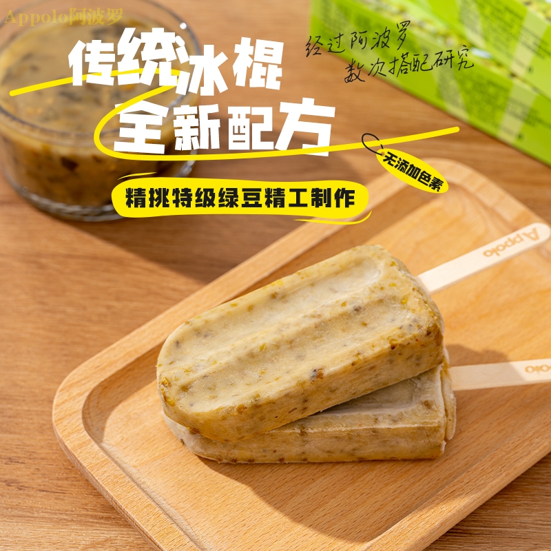 传统冰棍,全新配方,经过阿波罗无数次搭配研究,每一项添加都是为了美味和健康,挑选选颗颗特级绿豆精工制作,0添加色素;高温长时间熬制,绵软可口,入口即化,不添加甜味剂,创新的冷热吃法,冷吃冰爽消暑,清凉一夏,加热后秒变温暖糖水,修身养生,健康美味两不误,绿豆具有清热解毒的功效,能够清暑益气,特别适合盛夏食用,棒冰通身混有绿豆颗粒,清爽解暑看得见,清爽解渴又有大颗绿豆,美味实惠。与雪糕完美搭配,健康又美味。深受广大消费者欢迎,口感厚实,用料丰富,每一口都能吃到浓厚绵烂的绿豆,嚼得到。畅销各地,多年来最受广大消费者欢迎的传统冰棍,性价比高,负担感为零。